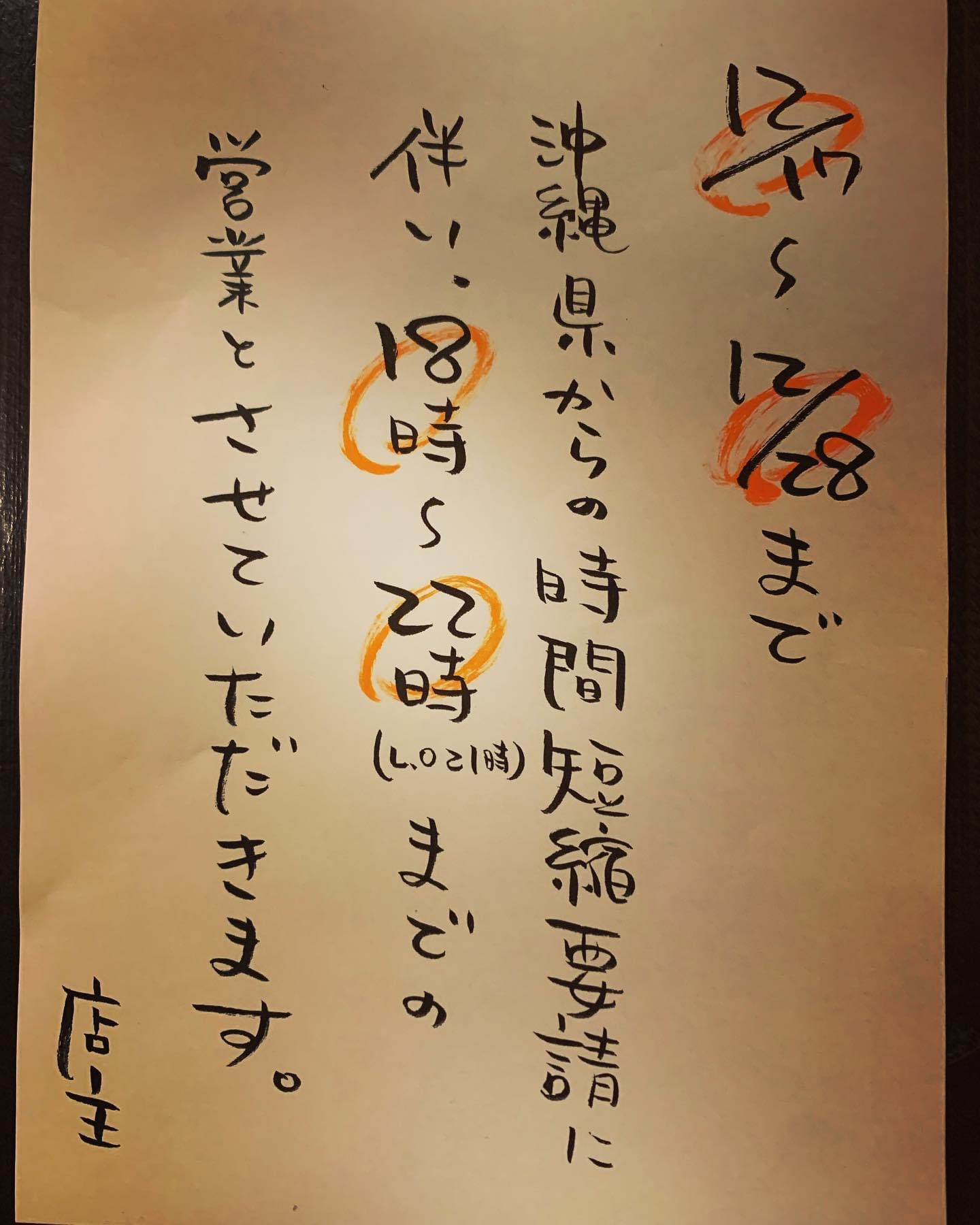 ホームお店情報 お知らせ。 2020年12月18日 SHARE ポスト シェア はてブ LINE 本日12月17日〜28日まで、沖縄県からの営業時短要請に伴い、18時〜22時までの営業とさせていただきます… お客さまにはご迷惑をおかけしますが、ご協力のほど宜しくお願いします🤲 コメントを残す コメントをキャンセルメールアドレスが公開されることはありません。 ※ が付いている欄は必須項目ですコメント ※ 名前 ※ メール ※ サイト 上に表示された文字を入力してください。